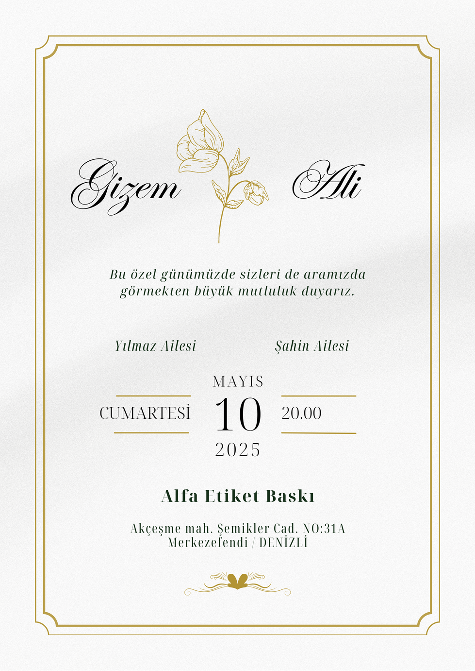 Düğün, nişan, doğum günü, açılış gibi tüm özel anlarınız için estetik ve kaliteli davetiyeler hazırlıyoruz. İsteğe özel tasarım, farklı kağıt seçenekleri ve zarif detaylarla hayalinizdeki davetiyeyi gerçeğe dönüştürüyoruz. Uygun fiyat ve hızlı teslimat avantajıyla yanınızdayız.